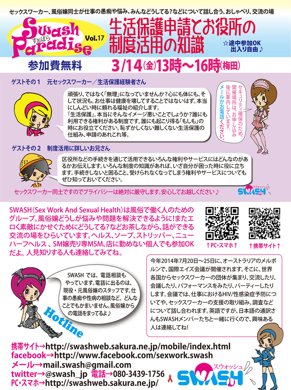 SWASHはSex Work and Sexual Healthの略で、風俗業に従事する女性が安全に安心して働ける職場を目指している。ブログの過去記事はおいおい読んでいくことにして、SWASHは風俗店店長との意見交流会なども企画していて、性風俗業者を共に良くしていくための仲間と認識している点に好感が持てます。それに、現実に実行できる施策まで自分の行動をブレイクダウンし、それに沿って地道に活動している点が素晴らしい。