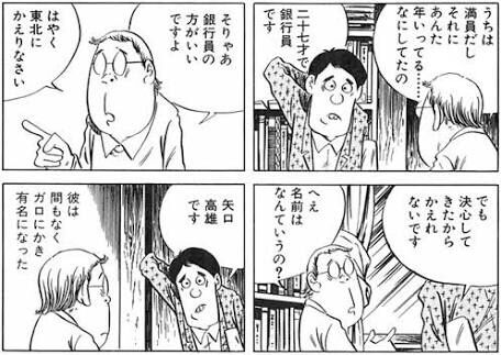 その結論を覆したのは、矢口さん自身によるプロデビュー直前の漫画と、それと同じシチュエーションの水木先生の漫画を見つけたからだ。矢口青年は銀行員時代に水木しげる先生に持ち込み原稿を見せている。このときの状況が、水木視点と矢口視点で、漫画として描かれていた。
