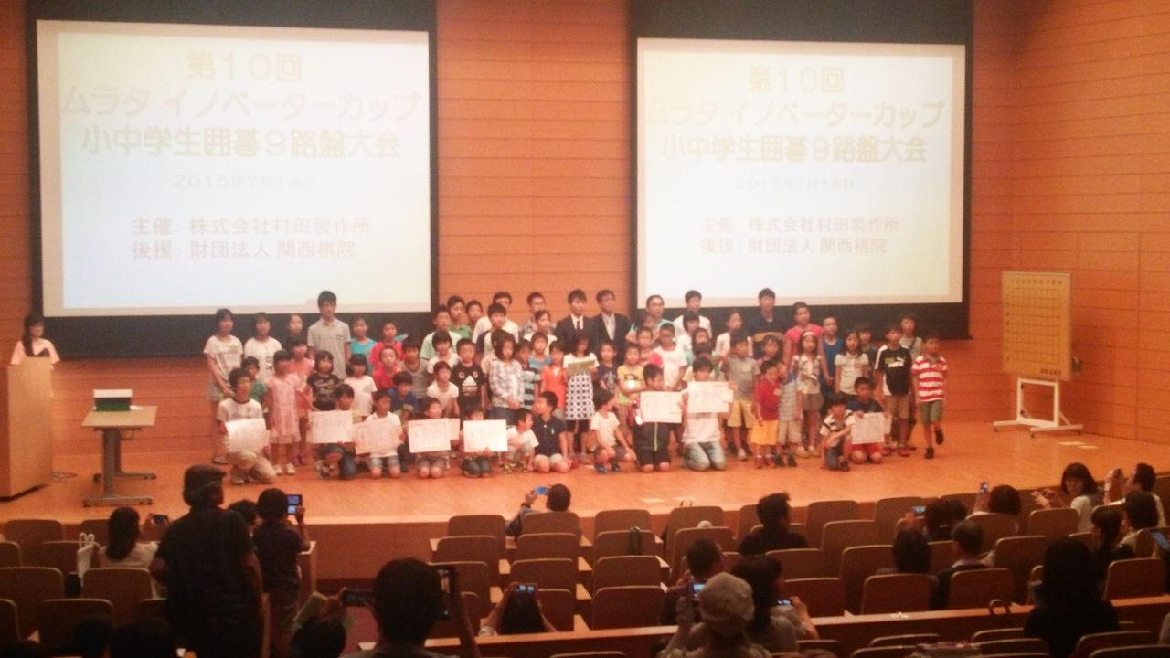 午後になって会場をホールに移し、各クラスの決勝を行う。席上対局のために緊張しているのがよく分かる。チャンピオン戦は男の子が女の子に勝ち、瀬戸八段と戦うことになった。コミなし碁だから男の子が勝てると思ったけど、中盤に緩手があったようで大差となり、プロの技を見るばかりとなった。最後は、参加者全員を壇上にあげての記念撮影だ。今年はトラブルもなく、無事に大会を終えることが出来た。だんだんと運営スキルが向上しているのかなあ。