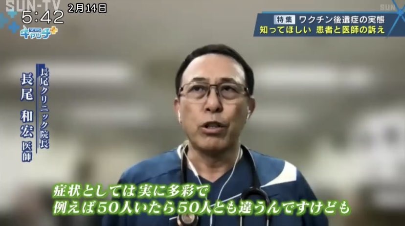 長尾医師が、ワクチン後遺症患者を診ているという。エビデンスはないが確実な事実だと彼は言う。彼がなぜワクチン後遺症と分かったかというと、患者がワクチンを打っていたからだ。その症状は様々で、死亡患者も多いらしい。