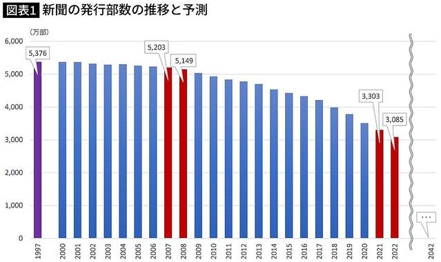 日本新聞協会が発表した2022年10月時点の新聞発行部数は3084万部。1年前に比べて218万部、率にして6.6%減少した。新聞発行のピークは1997年で、その時の総発行部数は5376万部。25年の間に2300万部余りが減少した。読売新聞は「発行部数世界一」でギネス記録にも認定され、かつて発行部数1000万部を超えていた。要は読売が2つ消えた格好である。